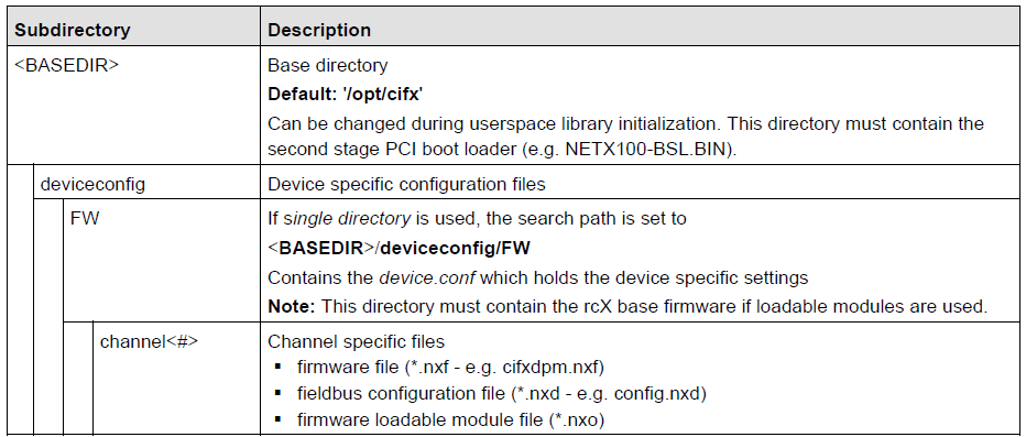 The script should have now created the base directory "/opt/cifx/" with the subfolders "deviceconfig", "deviceconfig/FW" and "deviceconfig/FW/channel0". Further it should have installed the boot loader within the base directory.